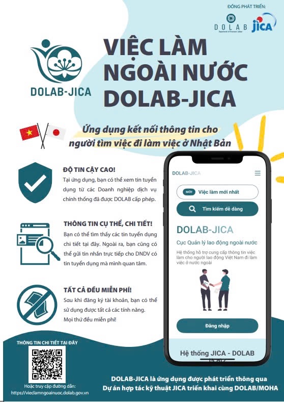 (dolab.moha.gov.vn) Trong khuôn khổ Dự án hợp tác kỹ thuật khởi động từ tháng 8 năm 2023 giữa Cục quản lý lao động ngoài nước (DOLAB) - Bộ Nội vụ Việt Nam và Cơ quan hợp tác Quốc tế Nhật Bản (JICA), từ ngày 30 tháng 7 năm 2025, Ứng dụng tìm kiếm việc làm tại Nhật Bản DOLAB-JICA đã chính thước được đưa vào vận hành.