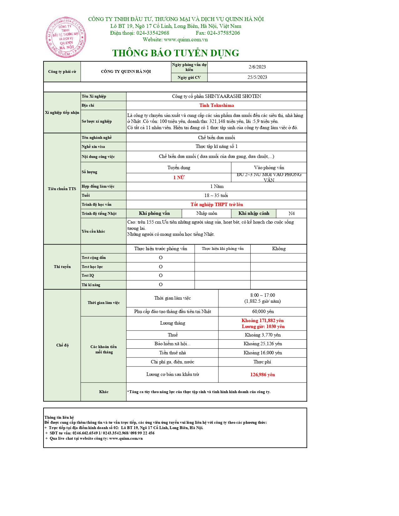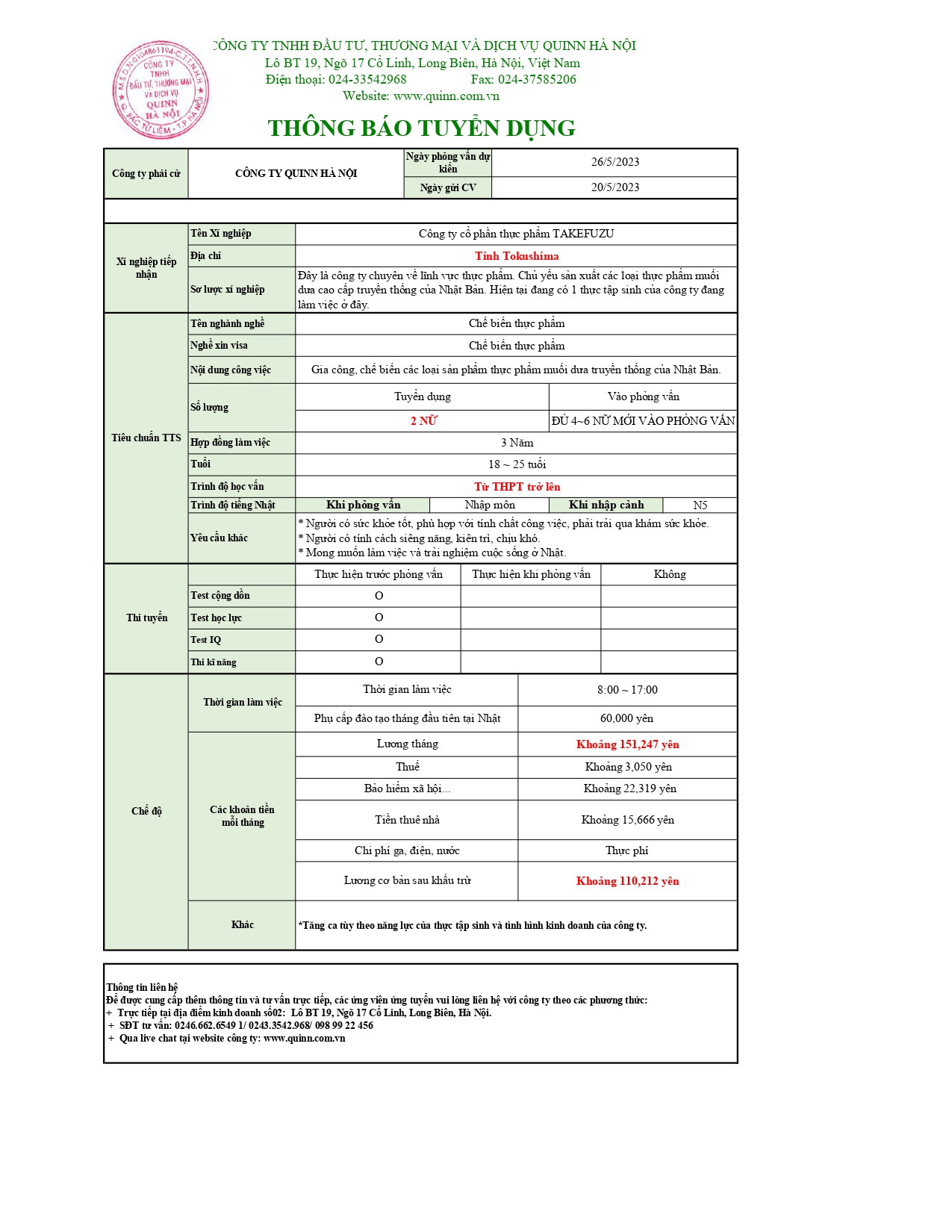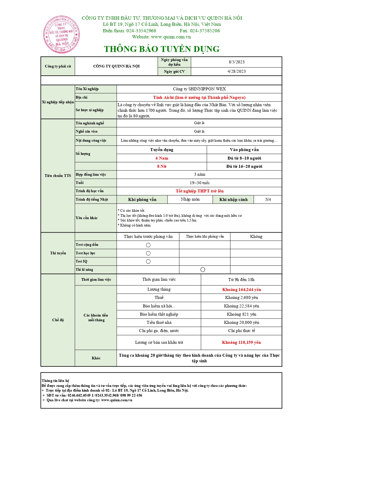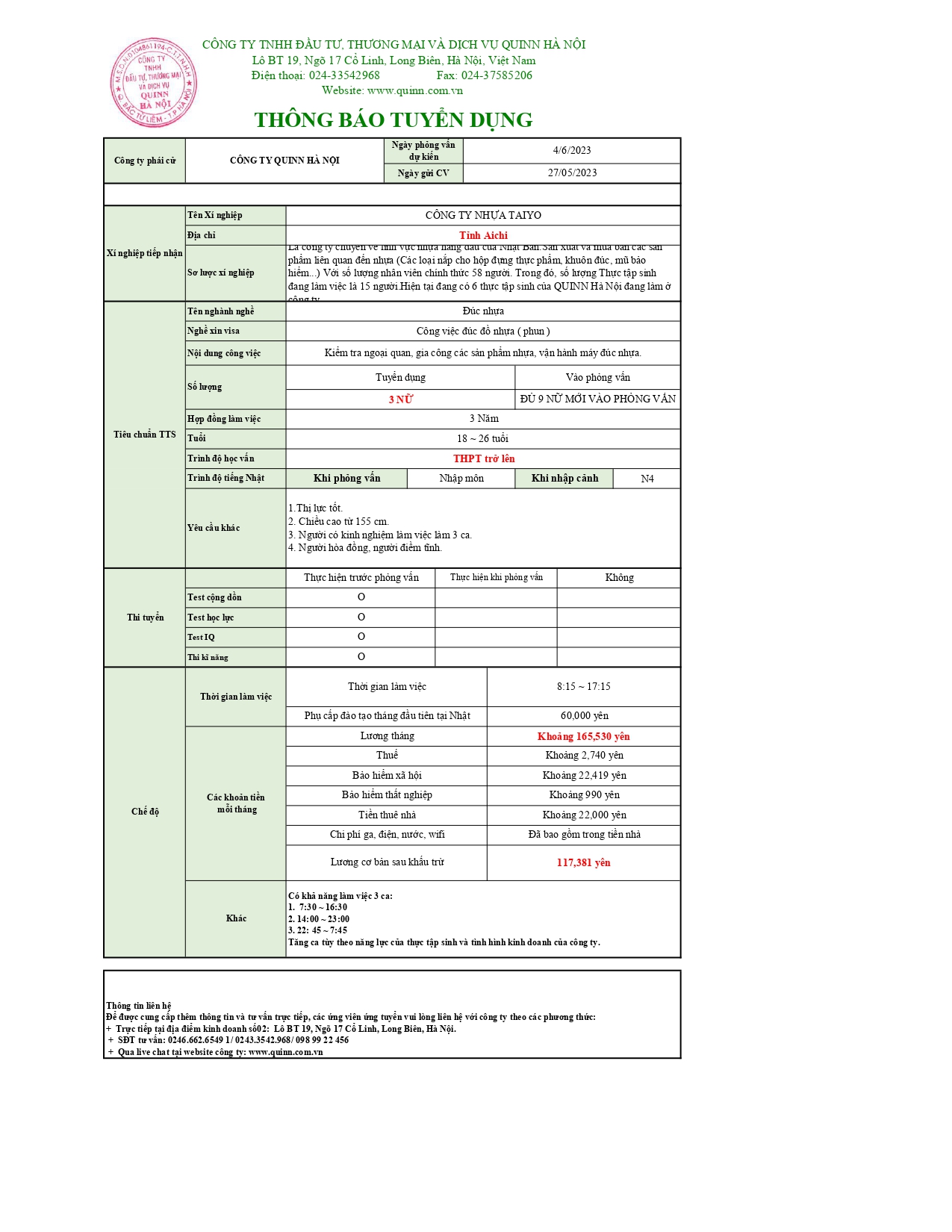 Liên hệ{name_null}{phone_null}{mail_error}{mail_null}{address_null}content_nullGửiHủy Tin tức mớiThông tin tổ chức kỳ thi đánh giá kỹ năng trong lĩnh vực sản xuất sản phẩm công [...]13:22:00 03-12-2025Thông báo về chế độ bảo hiểm công Nhật Bản dành cho thực tập sinh nước [...]14:18:00 15-11-2025Chính thức vận hành Ứng dụng tìm kiếm việc làm tại Nhật Bản DOLAB-JICA từ ngày 30 tháng 7 [...]23:40:15 11-10-2025Thông tin tổ chức kỳ thi đánh giá năng lực tiếng Nhật cơ bản (JFT – [...]08:11:00 29-09-20258 tháng đầu năm 2025: Gần 100 nghìn lao động Việt Nam đi làm việc ở nước [...]13:27:02 09-09-2025Kết quả công tác đưa lao động Việt Nam đi làm việc ở nước ngoài tháng 7 và 7 tháng đầu [...]14:24:00 28-08-2025XUẤT KHẨU LAO ĐỘNG GIỮ ĐÀ TĂNG TRƯỞNG15:12:00 11-08-2025NGƯỜI LAO ĐỘNG "SĂN" VIỆC Ở NƯỚC NGOÀI NHƯ CÁCH TÌM ĐỒ ĂN TRÊN ỨNG [...]16:50:00 31-07-2025THÔNG BÁO TUYỂN LAO ĐỘNG ĐI LÀM VIỆC TẠI SINGAPORE - ĐƠN THỢ GẠCH ỐP LÁT, XÂY [...]14:20:00 11-12-2024THÔNG BÁO TUYỂN LAO ĐỘNG ĐI LÀM VIỆC TẠI TÂY BAN NHA - ĐƠN GIA CÔNG KIM [...]14:30:00 05-12-2024 THÔNG BÁO TUYỂN DỤNG NHẬT BẢN 05/2023 Tags: ,