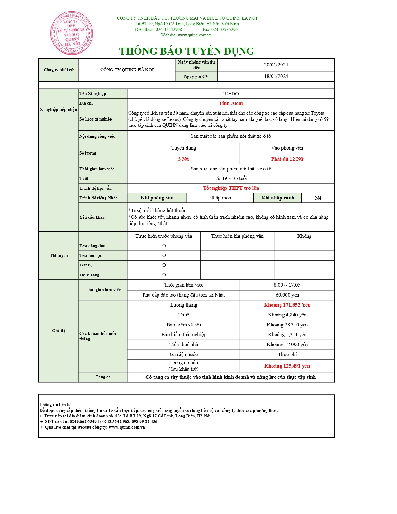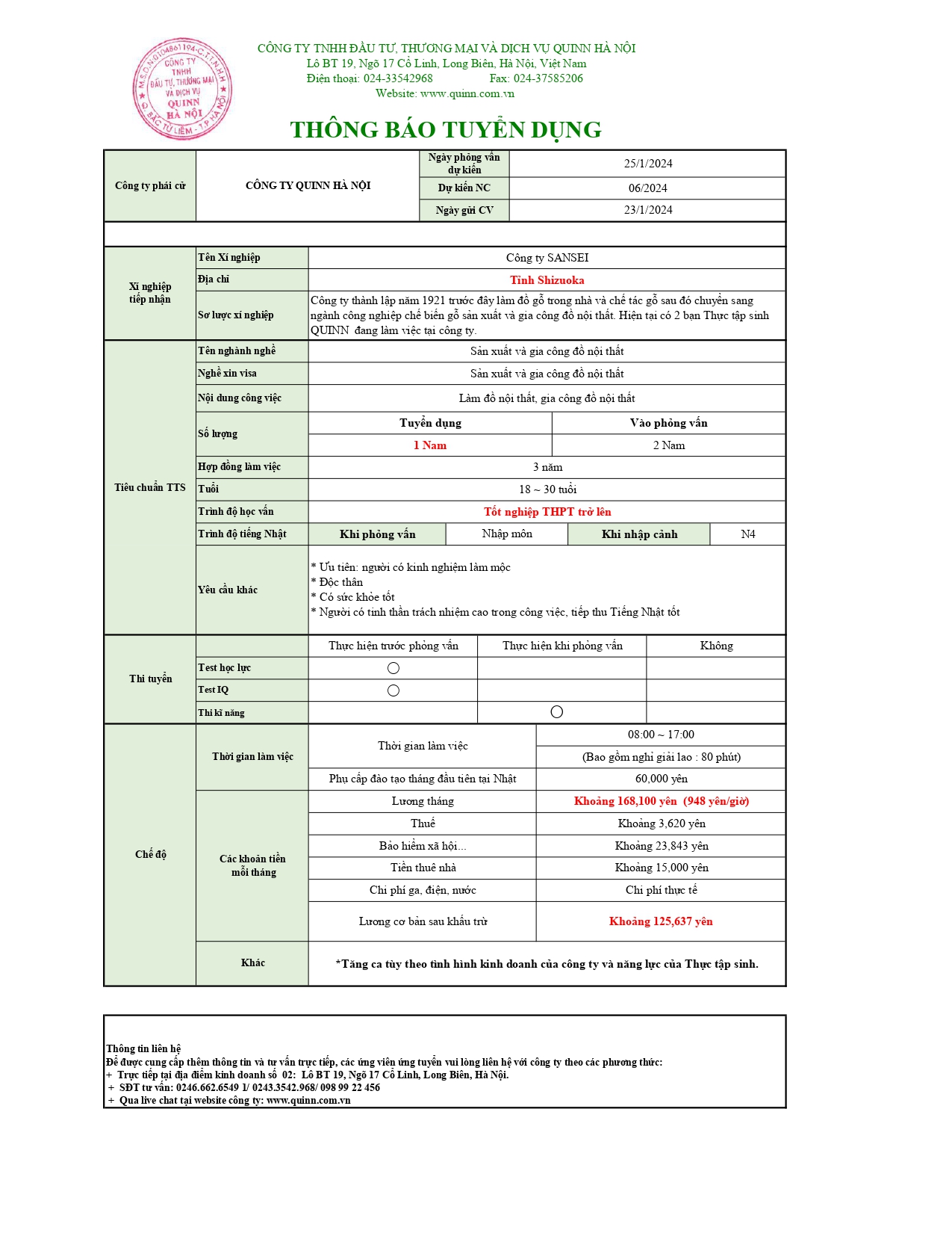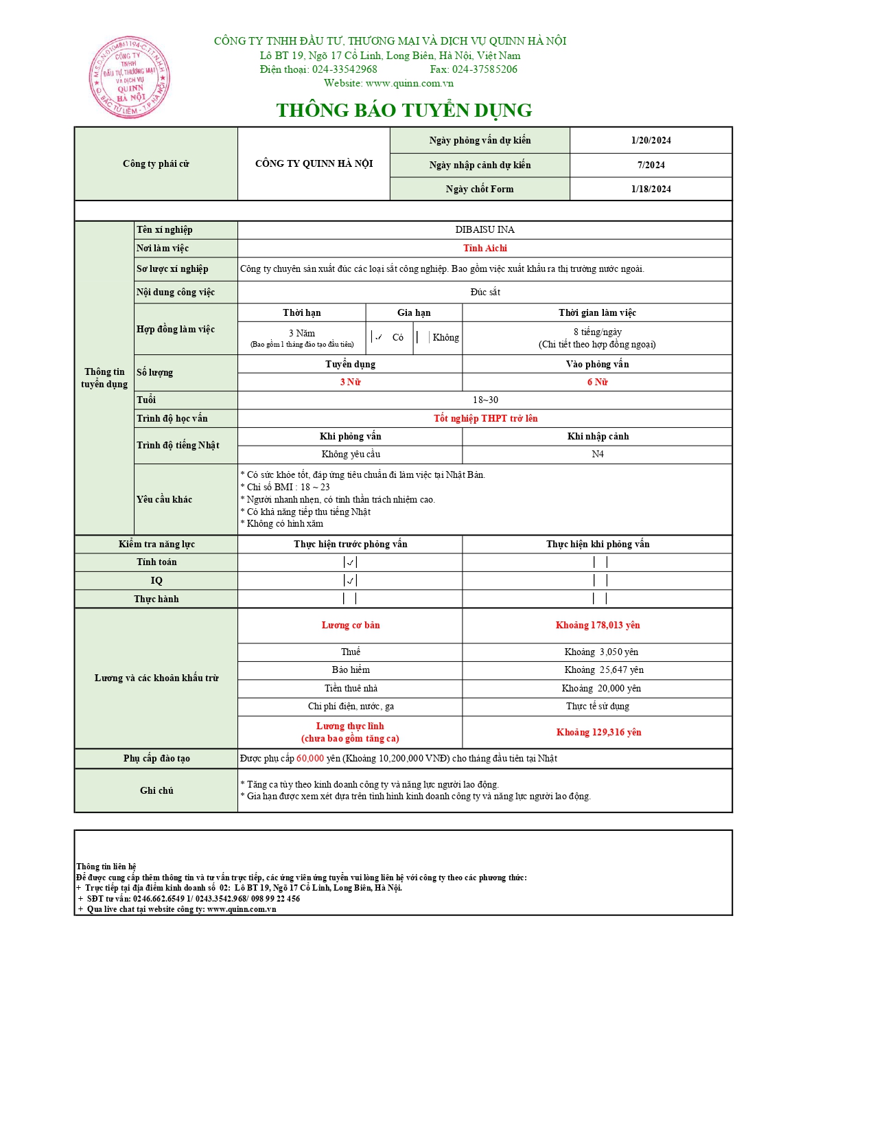 Liên hệ{name_null}{phone_null}{mail_error}{mail_null}{address_null}content_nullGửiHủy Tin tức mớiThông tin một số quy định liên quan trong giai đoạn chuyển tiếp từ chương trình Thực tập [...]13:36:00 24-02-2026Thông tin tổ chức kỳ thi đánh giá kỹ năng trong lĩnh vực sản xuất sản phẩm công [...]13:22:00 03-12-2025Thông báo về chế độ bảo hiểm công Nhật Bản dành cho thực tập sinh nước [...]14:18:00 15-11-2025Chính thức vận hành Ứng dụng tìm kiếm việc làm tại Nhật Bản DOLAB-JICA từ ngày 30 tháng 7 [...]23:40:15 11-10-2025Thông tin tổ chức kỳ thi đánh giá năng lực tiếng Nhật cơ bản (JFT – [...]08:11:00 29-09-20258 tháng đầu năm 2025: Gần 100 nghìn lao động Việt Nam đi làm việc ở nước [...]13:27:02 09-09-2025Kết quả công tác đưa lao động Việt Nam đi làm việc ở nước ngoài tháng 7 và 7 tháng đầu [...]14:24:00 28-08-2025XUẤT KHẨU LAO ĐỘNG GIỮ ĐÀ TĂNG TRƯỞNG15:12:00 11-08-2025NGƯỜI LAO ĐỘNG "SĂN" VIỆC Ở NƯỚC NGOÀI NHƯ CÁCH TÌM ĐỒ ĂN TRÊN ỨNG [...]16:50:00 31-07-2025THÔNG BÁO TUYỂN LAO ĐỘNG ĐI LÀM VIỆC TẠI SINGAPORE - ĐƠN THỢ GẠCH ỐP LÁT, XÂY [...]14:20:00 11-12-2024THÔNG BÁO TUYỂN DỤNG NHẬT BẢN 01/24 Tags:,